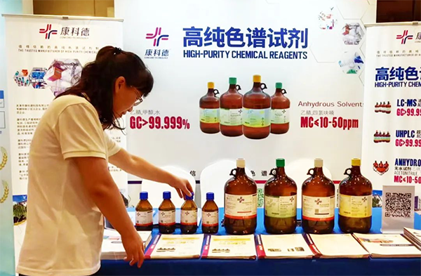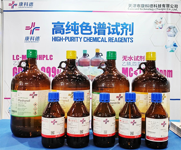 康科德公司在現場展示了液質聯用級試劑、超純色譜級試劑、超干試劑及卡爾費休試劑等高端系列產品,贏得專家老師的高度評價和認可。現場工作人員為沈陽藥科大學的實驗老師提供了四氫呋喃過濾時間長發黃情況的解決方案,沈陽藥科大學的老師給予了充分肯定,并在現場達成了合作。此次康科德為制藥行業質量控制技術的高質量發展貢獻了力量,也充分展現了康科德在高純化學試劑領域的深厚實力與技術水平。