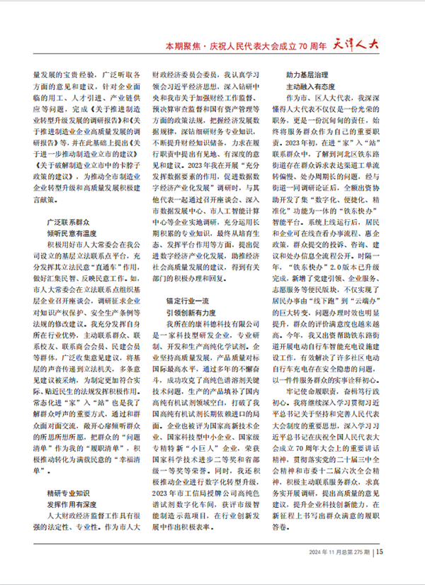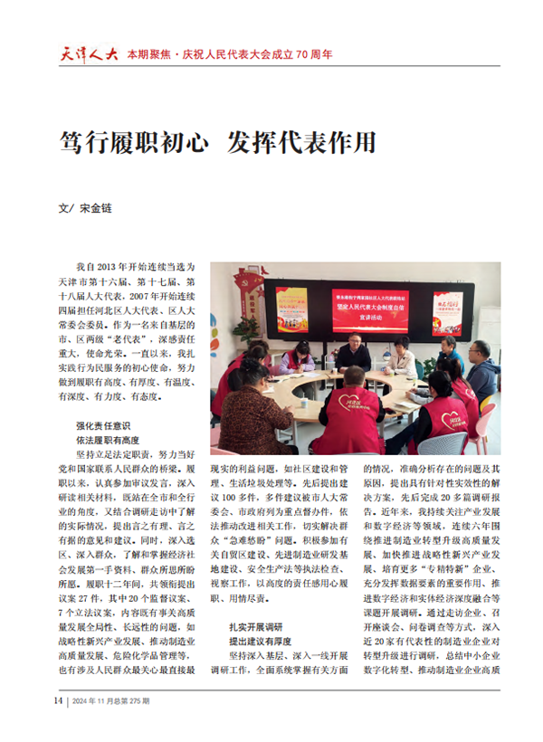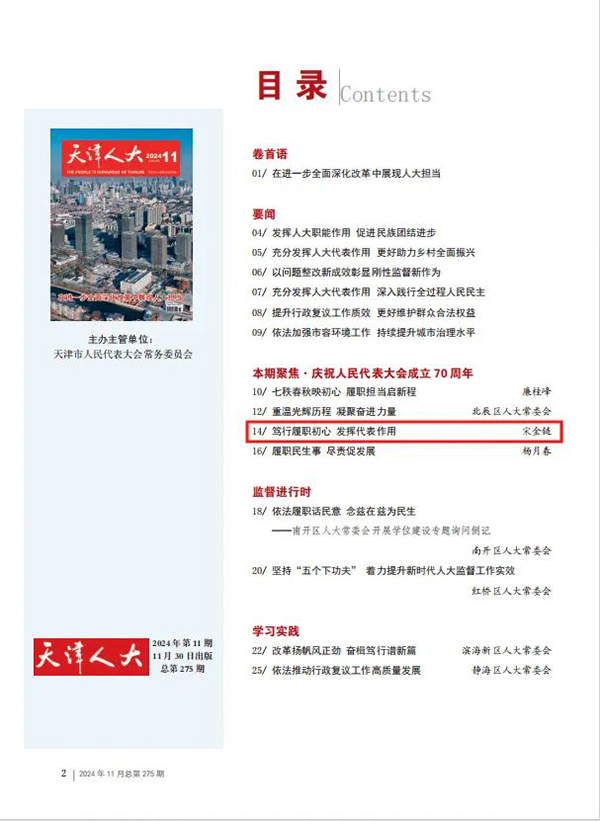 《天津人大》雜志2024年第11期在聚焦·慶祝人民代表大會(huì)成立70周年欄目中刊發(fā)康科德公司總經(jīng)理、市人大代表宋金鏈文章《篤行履職初心 發(fā)揮代表作用》。全文如下: