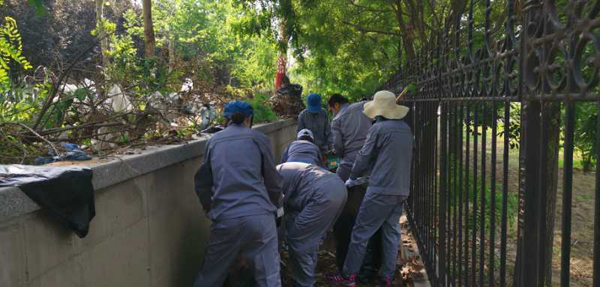 早上八時許,伴隨著夏日清晨溫暖的陽光,著裝整齊的十三名同志按照預(yù)定的方案開始清理工作,有序分工,團(tuán)結(jié)互助。他們有的用锨鏟,有的用手抓;有的用鋸割,有的做清掃。隨著氣溫的上升,汗水浸濕了衣裳,塵土掛落在臉龐,大家激情不減,干的熱火朝天。隨著一袋袋的枯葉、一車車的垃圾、一捆捆的殘枝被清運(yùn)出去,整潔干凈的隔離帶逐漸顯露出來。