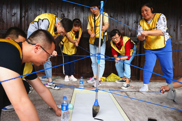 “共書未來”活動中,各隊成員同執一支筆,把此次的收獲融合企業文化總結成了四字成語共同書寫在四尺紙卷上。